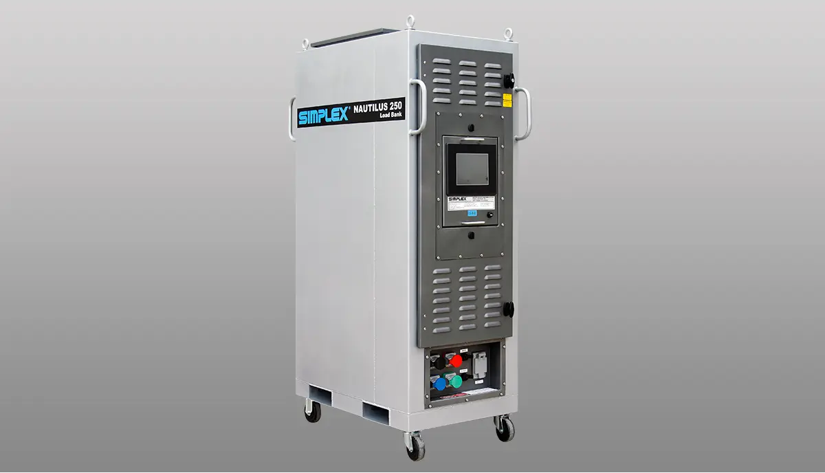 The Simplex Nautilus R 250KW water-cooled resistive load bank rental is a water-cooled load bank designed expressly for data-center chiller commissioning and testing applications. The Nautilus R is a compact, portable product featuring infinite power and water flow control for precise temperature rise setting versus applied power. The Nautilus R is fully networkable for control of single or multiple units from a remote station.